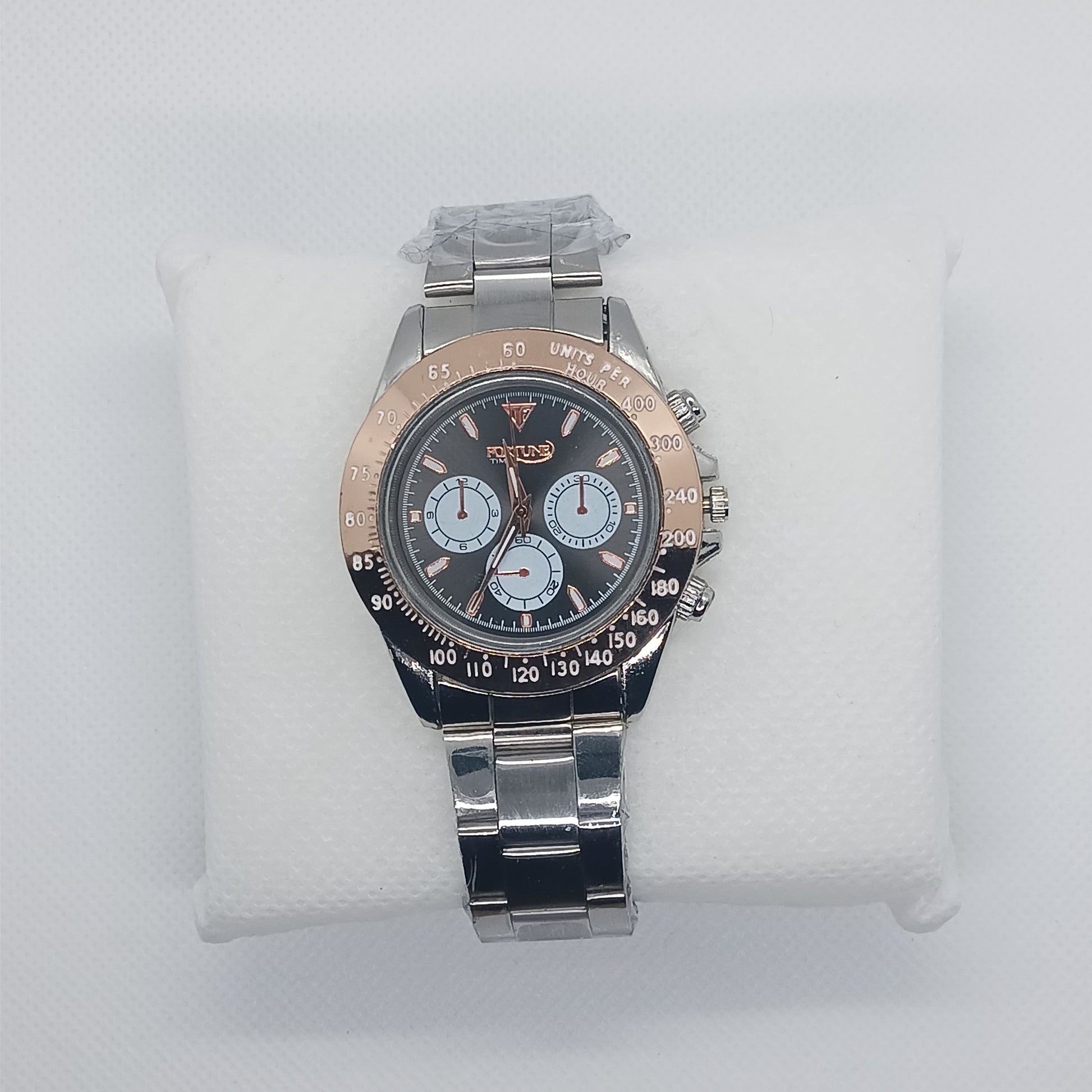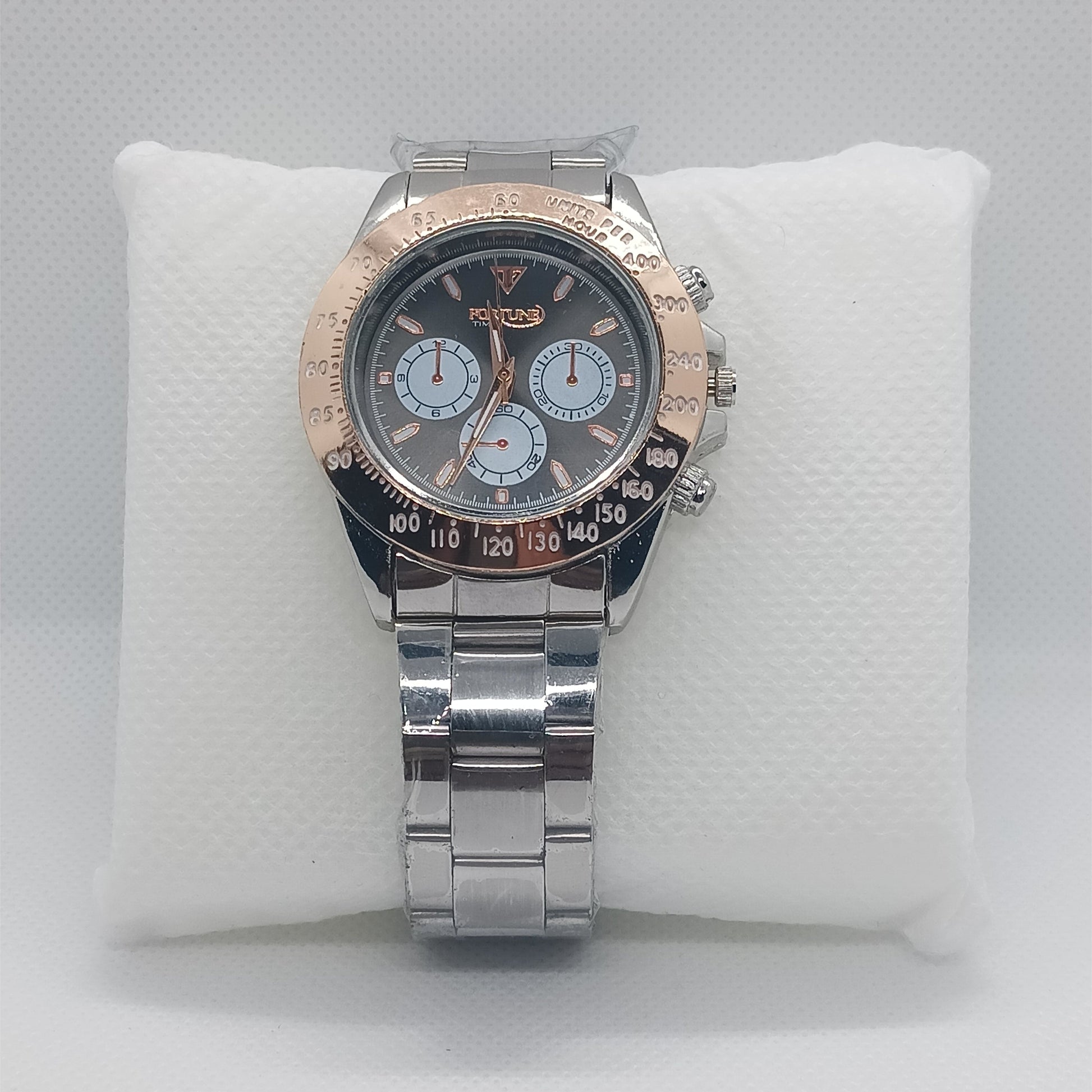 Make a lasting impression with the Apex Chronograph Black Dial Rose Gold Bezel Watch. Designed with a sleek black dial, framed by a luxurious rose-gold bezel, and paired with a silver stainless steel strap, this watch radiates modern luxury. Its chronograph functionality ensures accurate performance, while the two-tone design adds a refined edge to any outfit. Perfect for men who want a unique yet versatile timepiece that balances elegance and strength.