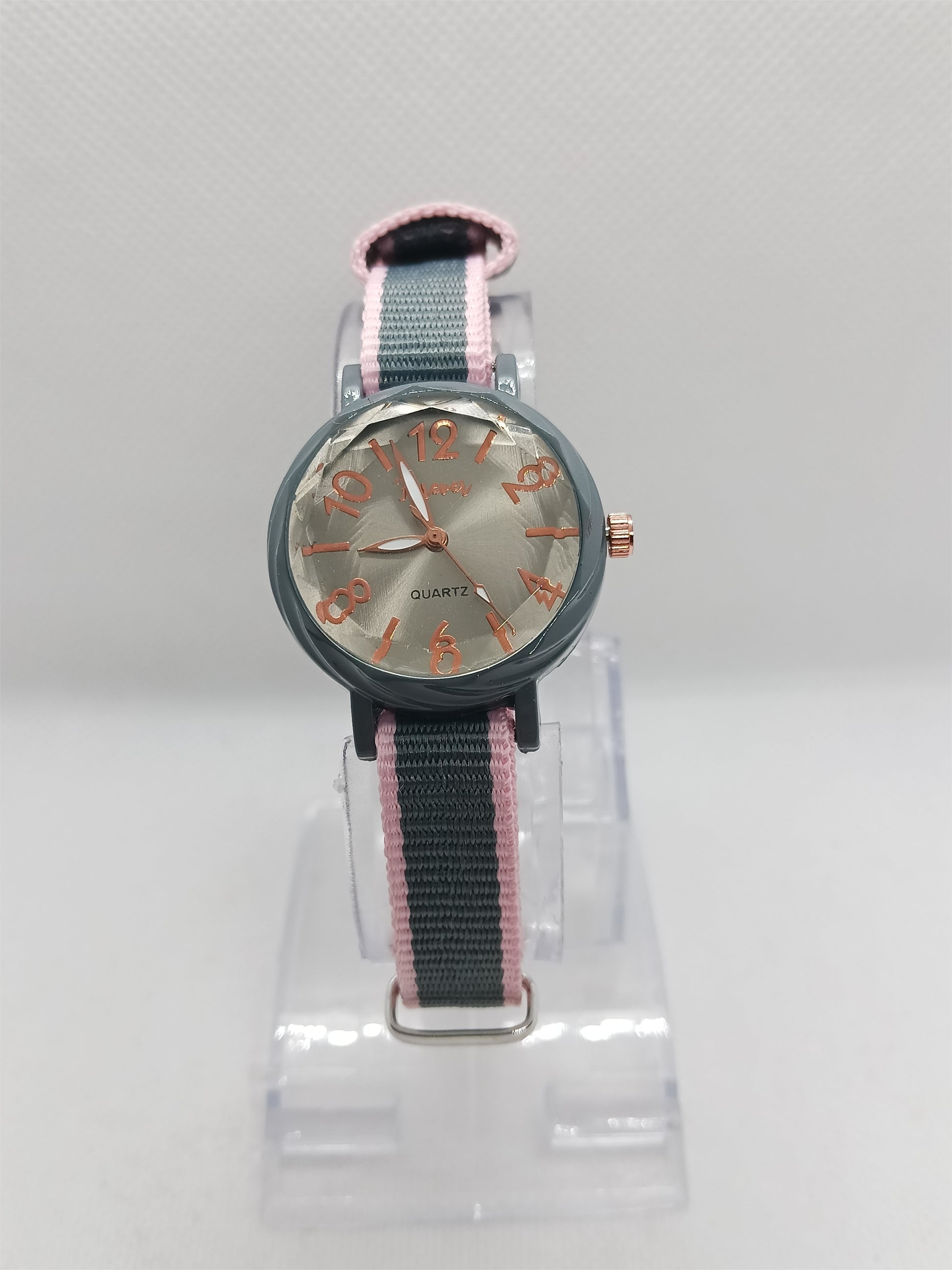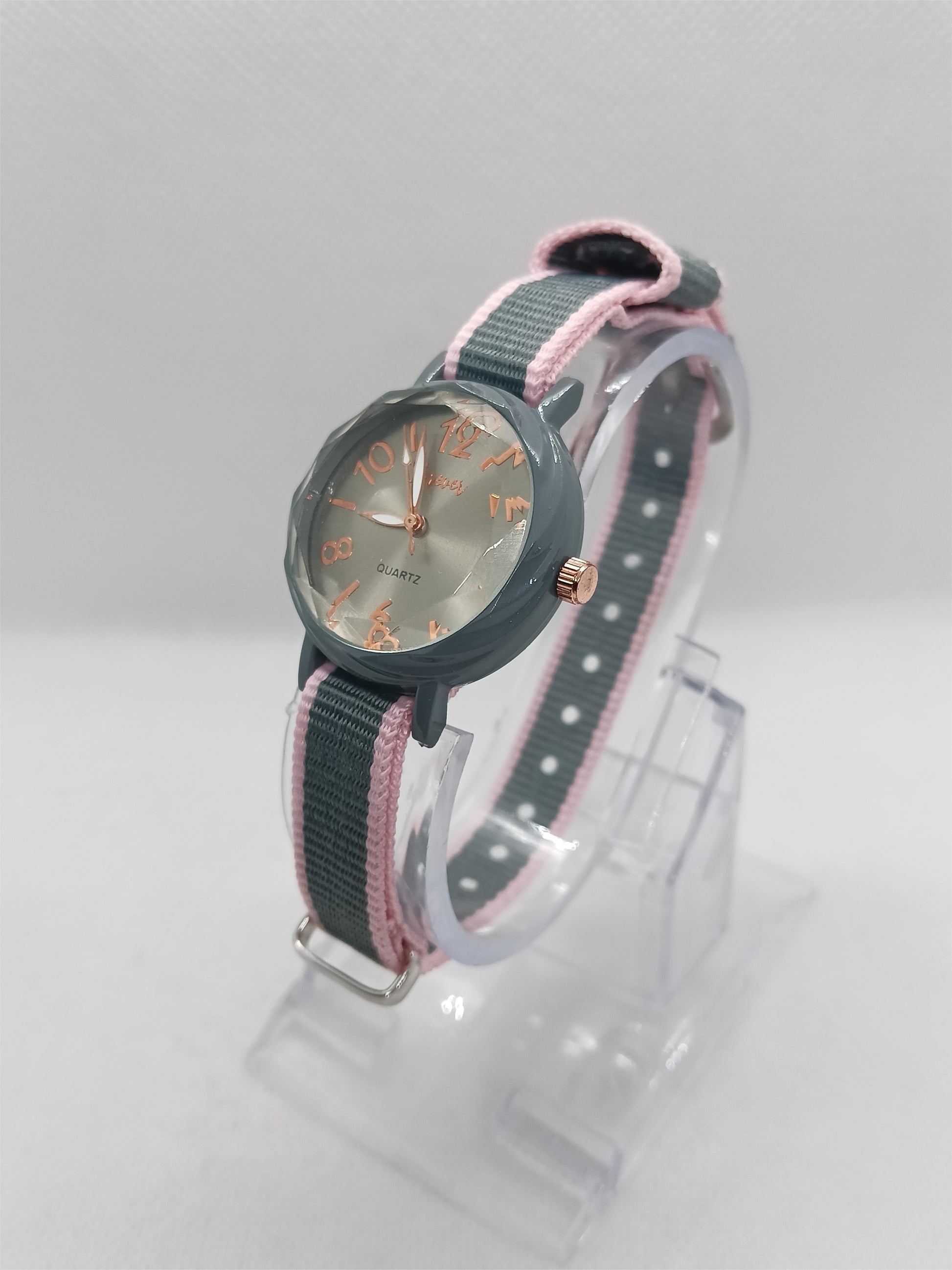 This watch offers a beautiful mix of soft colors and modern elegance. The grey dial with rose-gold details and a fabric strap with pink edges gives it a unique, stylish personality. It’s perfect for women who like subtle yet eye-catching accessories.