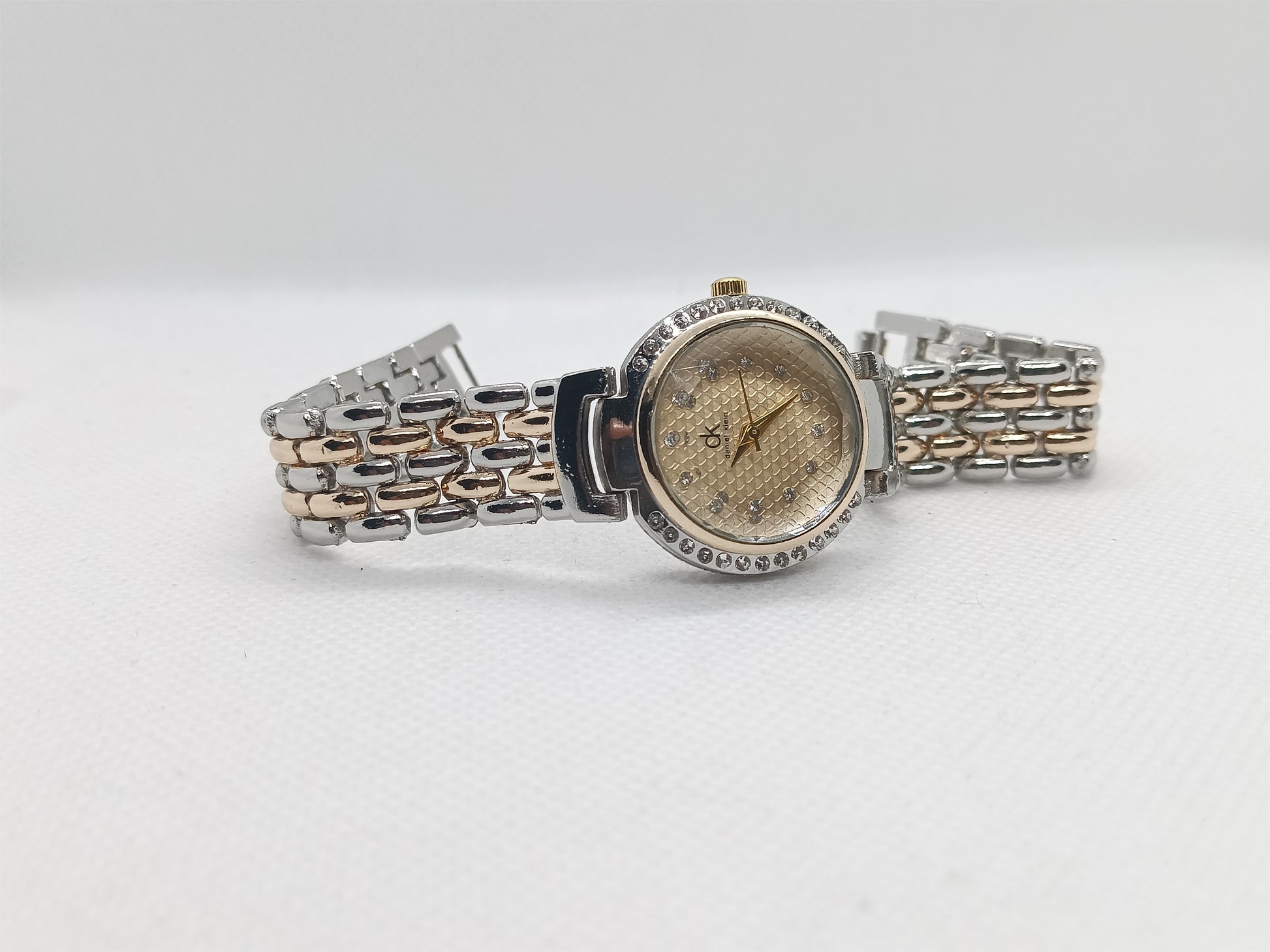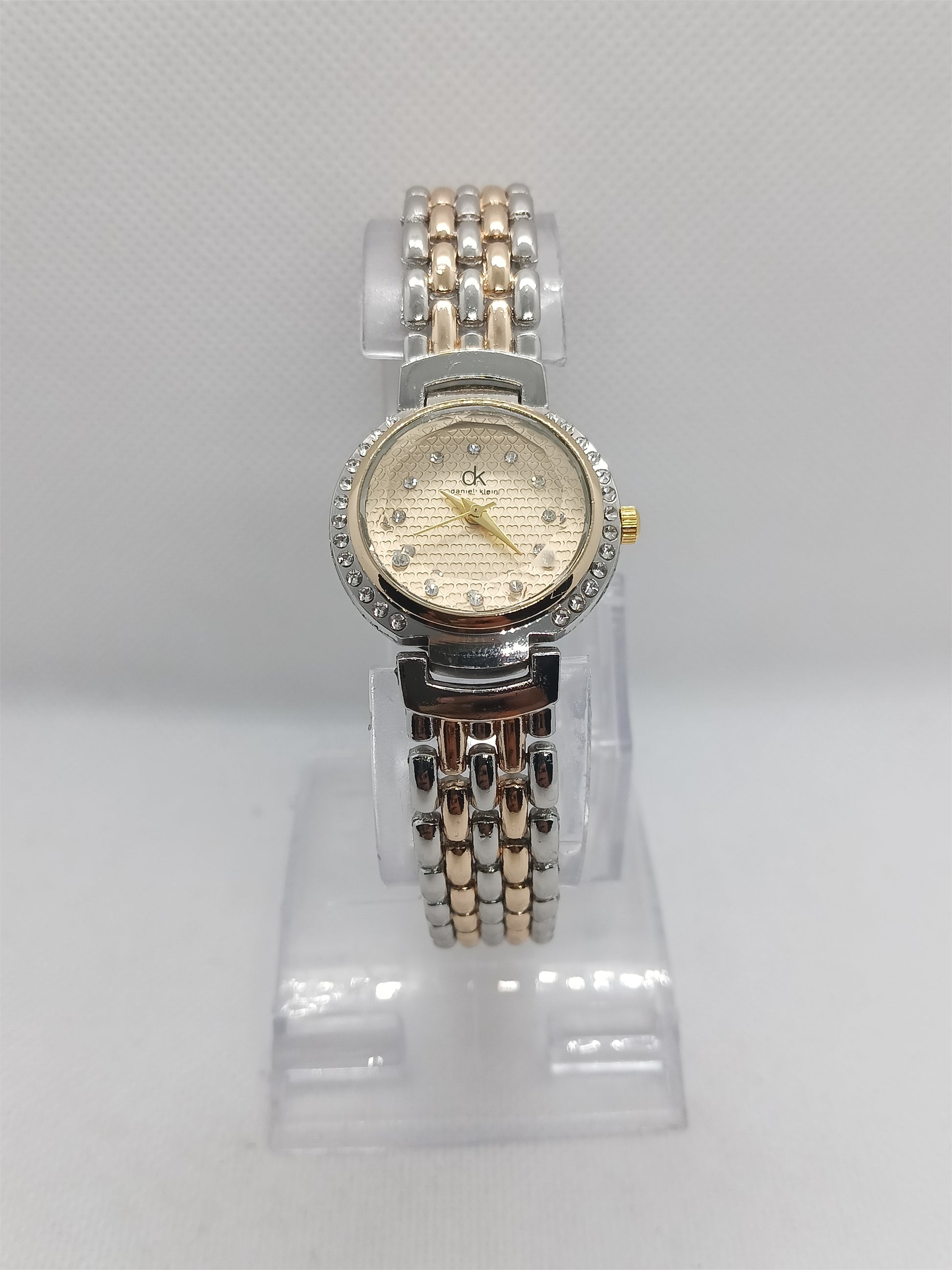 A luxurious watch with golden warmth and silver shine. The textured gold dial and crystal bezel give it a premium look that feels refined and timeless. It’s ideal for women who love elegant, standout accessories.