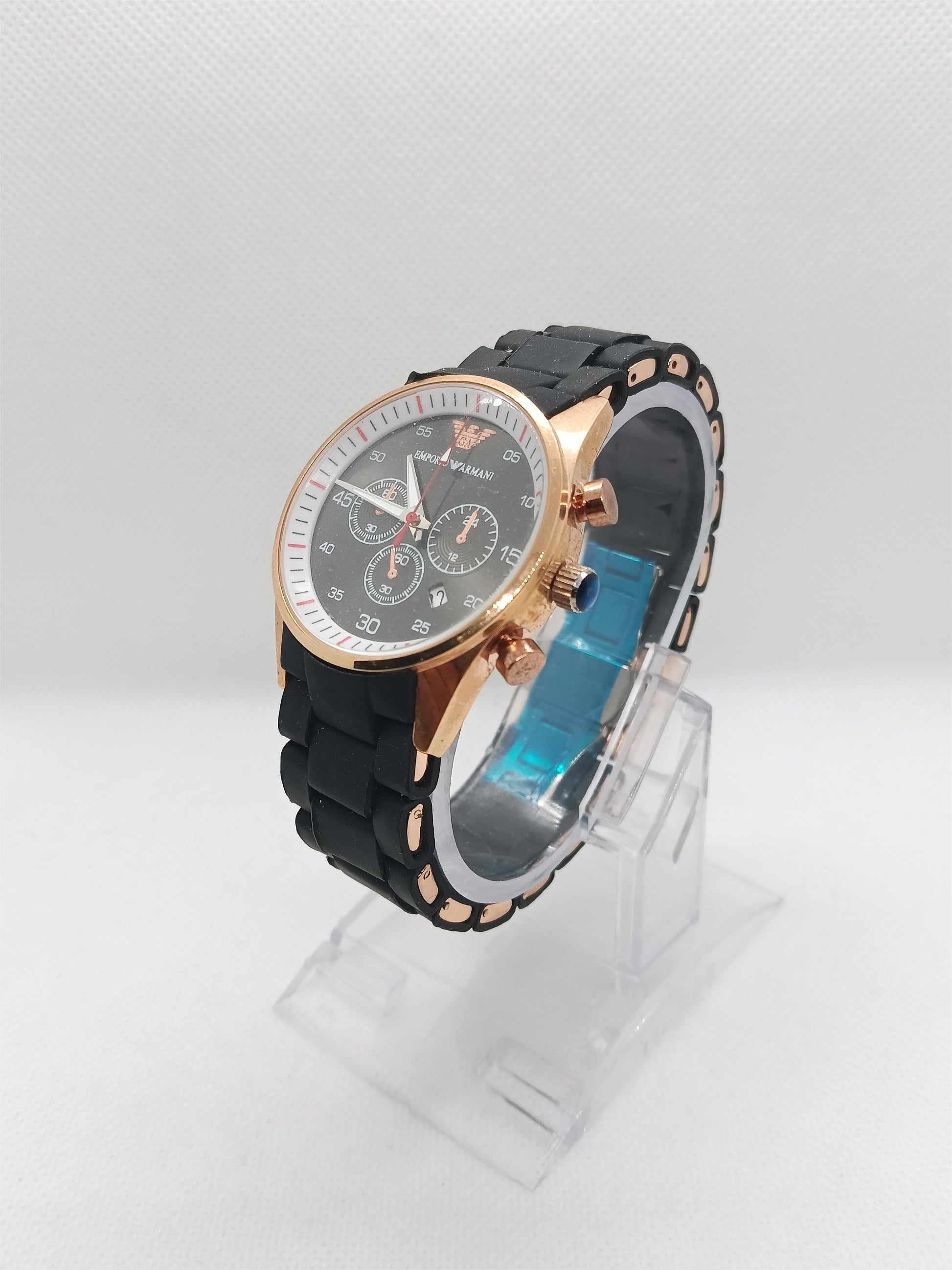 - Black dial with rose gold accents