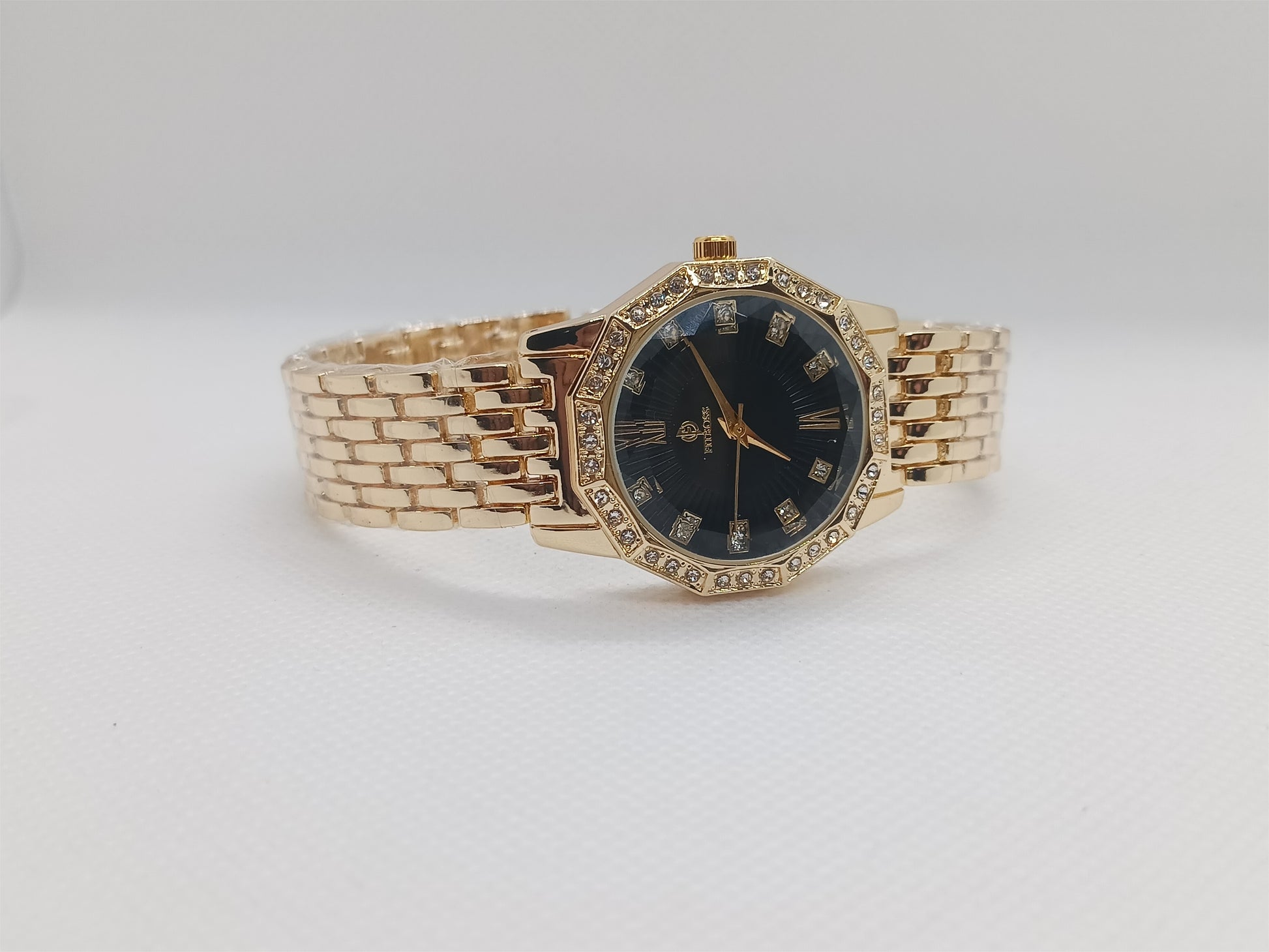 Bold, classy, and modern — the Midnight Grace Black Dial Edition stands out with its deep black dial, gold bracelet, and sparkling crystal rim. A stunning contrast that exudes power and elegance in every glance. Perfect for evening events or stylish daily wear.