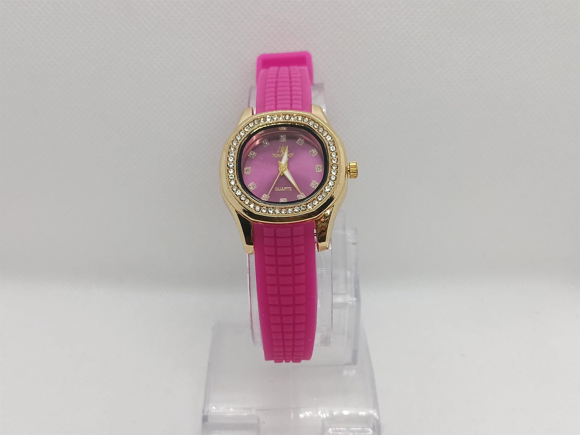 Bright, feminine, and effortlessly stylish — this timepiece blends a glossy pink strap with a polished golden case, creating a playful yet elegant look. The crystal-lined bezel gives just the right amount of shine, making it suitable for daily wear as well as special outings. Lightweight and comfortable, it adds a touch of luxury to casual outfits without ever feeling heavy or flashy.
