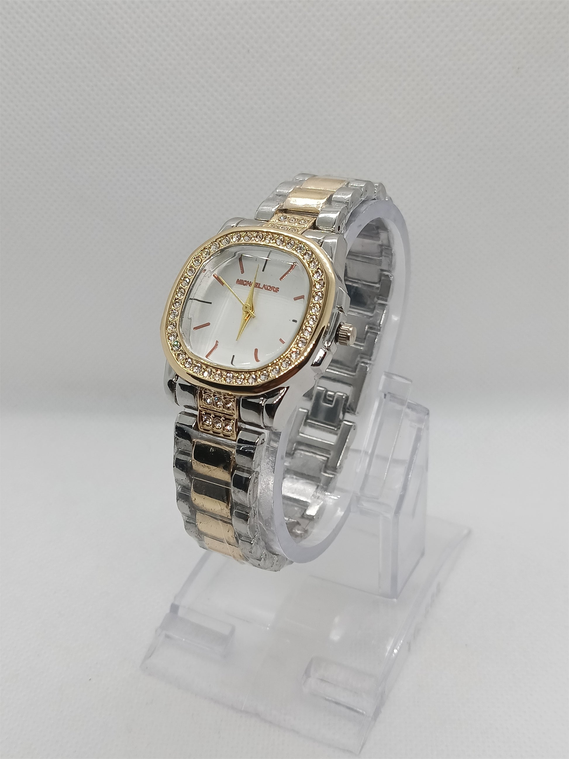 An elegant round timepiece designed in a blend of silver and soft gold tones, highlighted with a crystal-lined bezel for a luxurious finish. Its two-tone bracelet offers a timeless look that pairs effortlessly with professional outfits, formal evenings, or everyday style with a graceful touch.