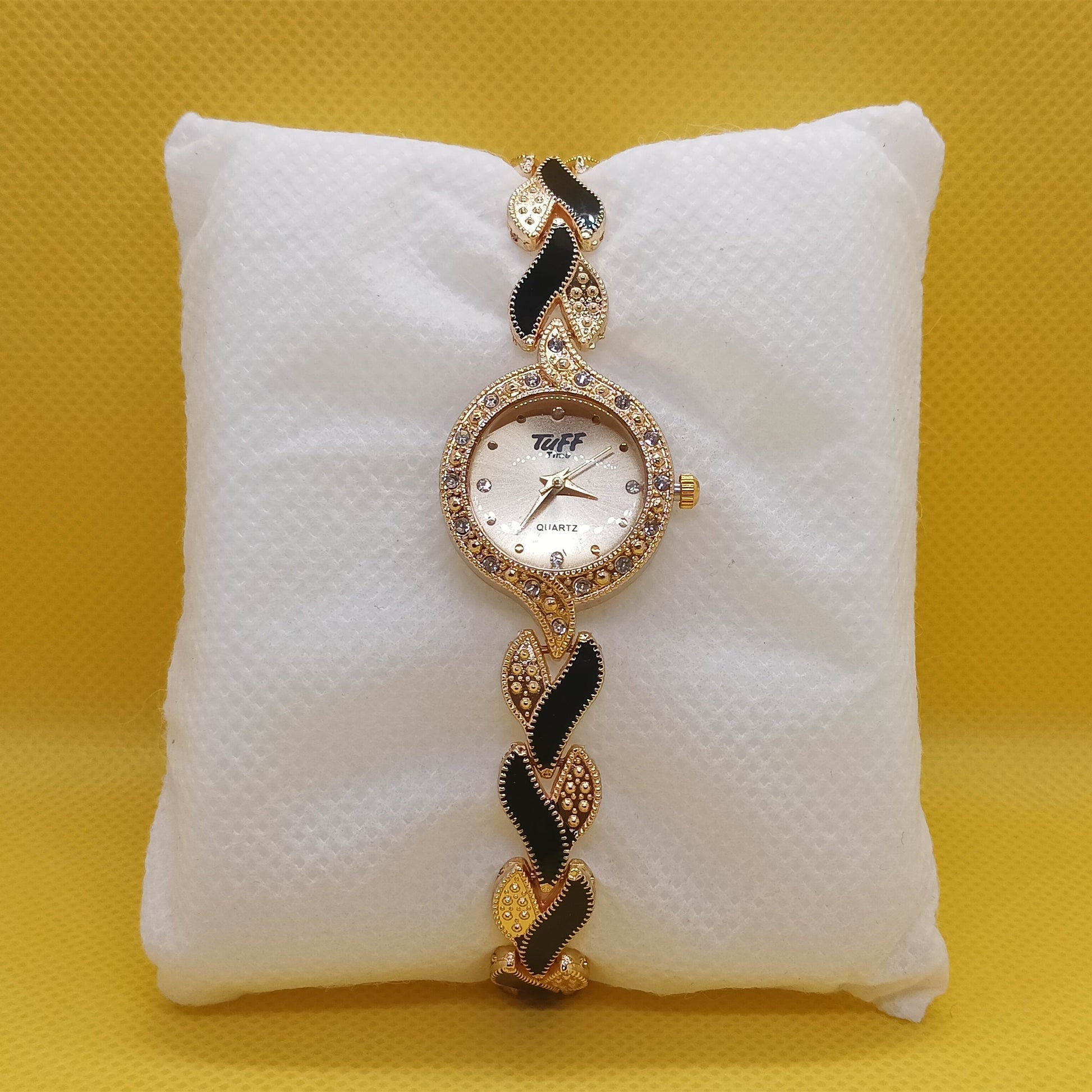 Enhance your look with the Twix Golden Charm Ladies Bracelet Watch — a stunning piece crafted with a champagne-gold dial, crystal-studded bezel, and a black & gold braided strap. This watch adds a luxurious vibe to any outfit, making it a must-have for fashion-forward women.