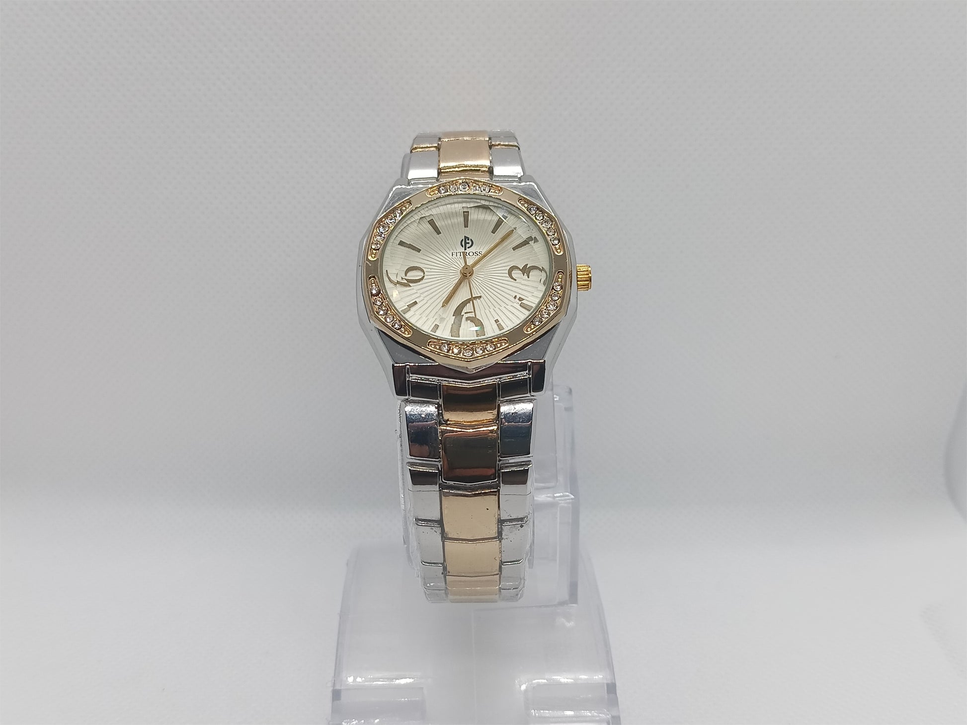 Stylish dual-tone ladies’ watch featuring a champagne dial and crystal-accented bezel. A blend of elegance and everyday sophistication.