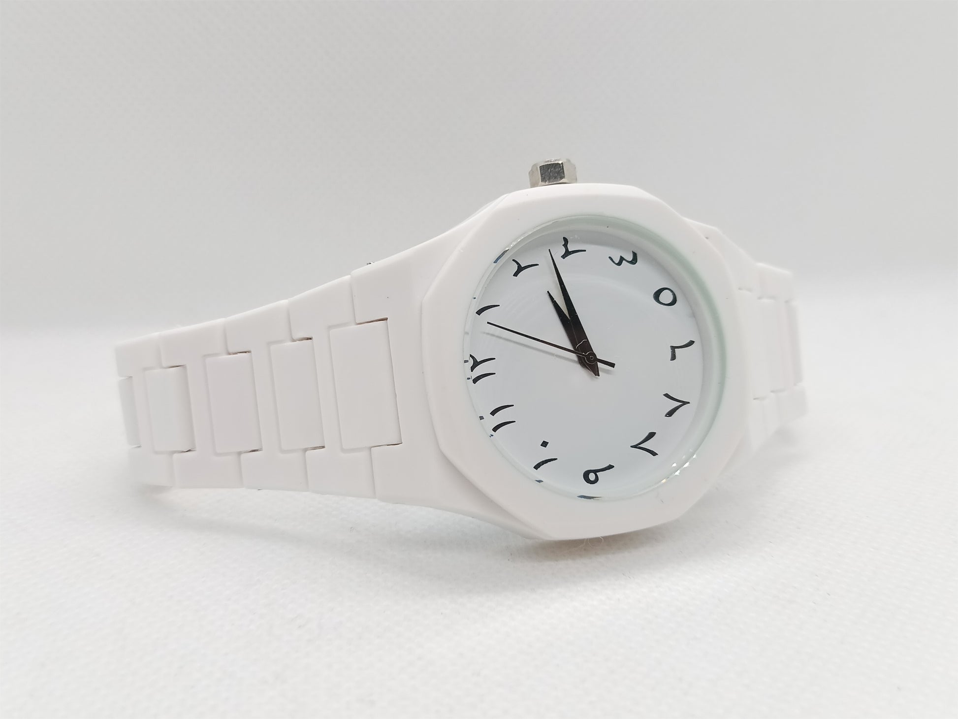 - Classic fresh-white dial with elegant Arabic numerals